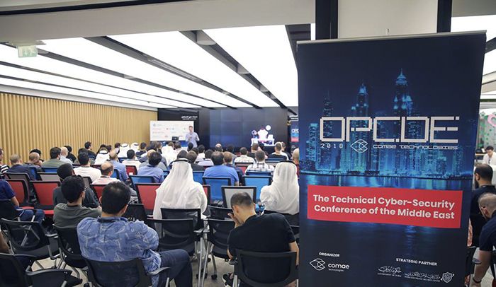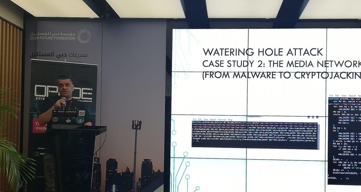 Dekeneas, on stage at the OPCDE Dubai cybersecurity conference