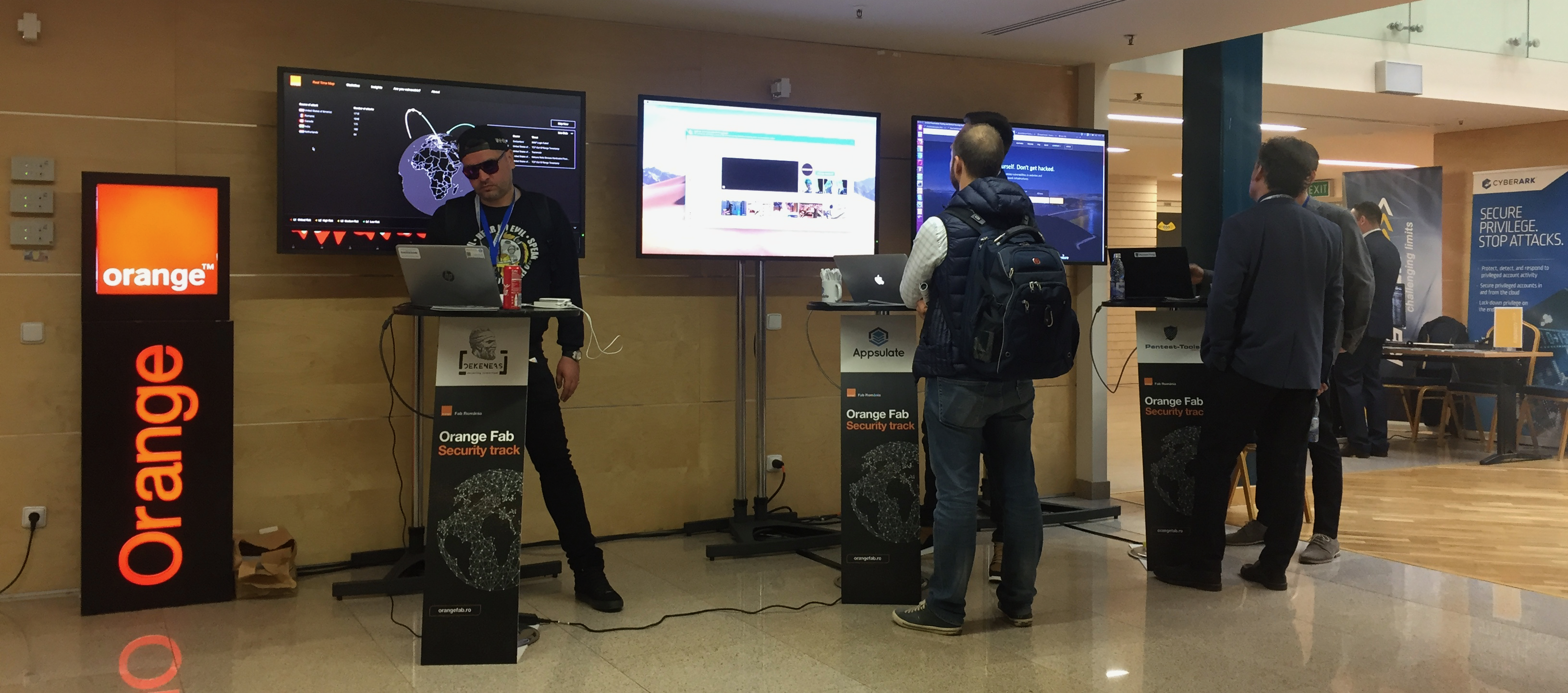 During the event hosted by the National Library of Romania, the Orange booth showcased the three Orange Fab companies. The startups presented demos of their own products and the Business Internet Security Threat Map - product which integrates technology from Orange Fab companies (PentestTools, Dekeneas and Fullscreen Digital), as well as developments made by Orange and Bit Sentinel.